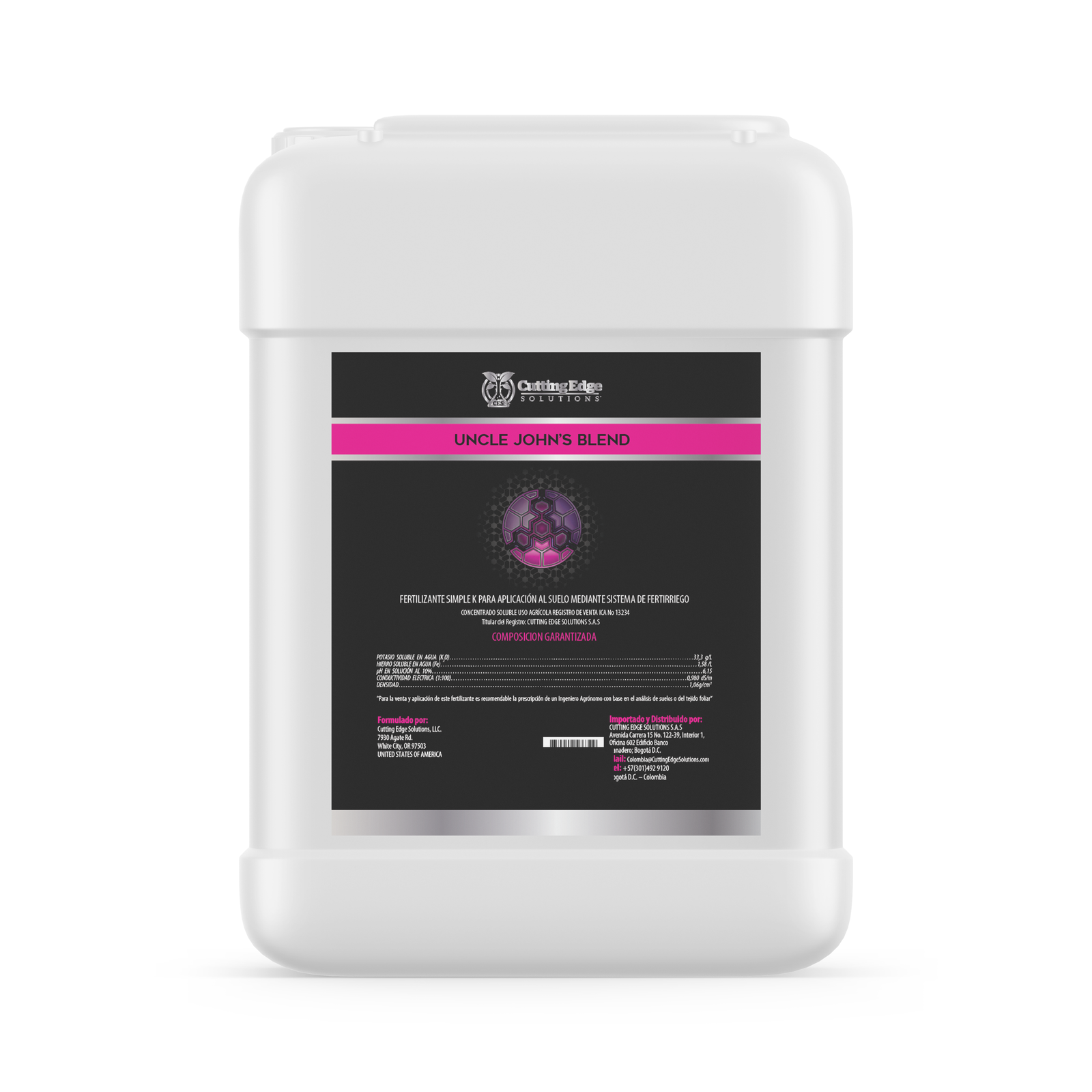Uncle John’s Blend™ está formulado para uso en cultivos hidropónicos, substrato, alimentación continuo, drenaje continuo y para uso en suelo. Úselo también como sistema foliar para reducir el estrés del trasplante y para corregir las deficiencias de potasio en las plantas con flores.